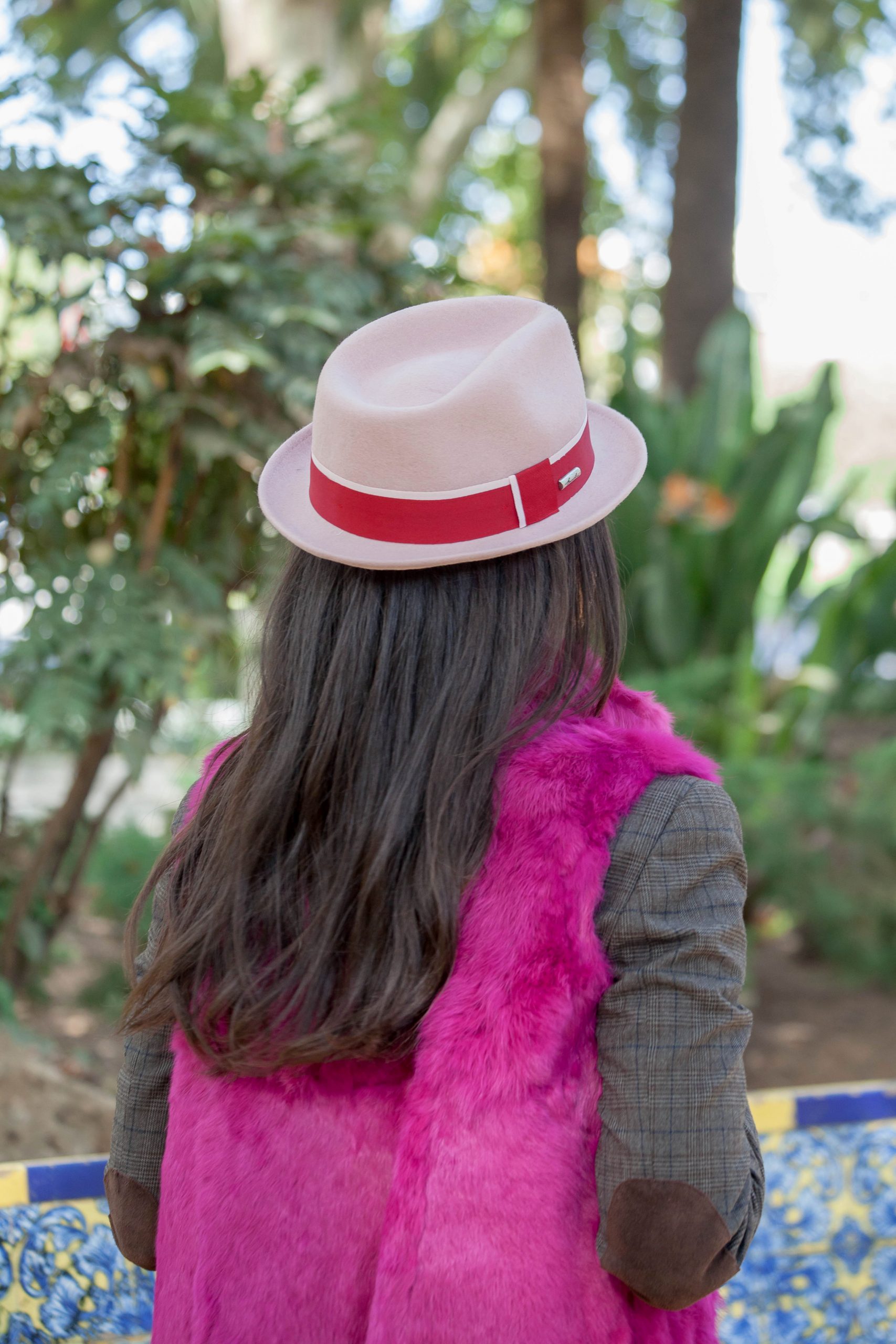 Sombrero de fieltro ajustable con ala chica color rosa.